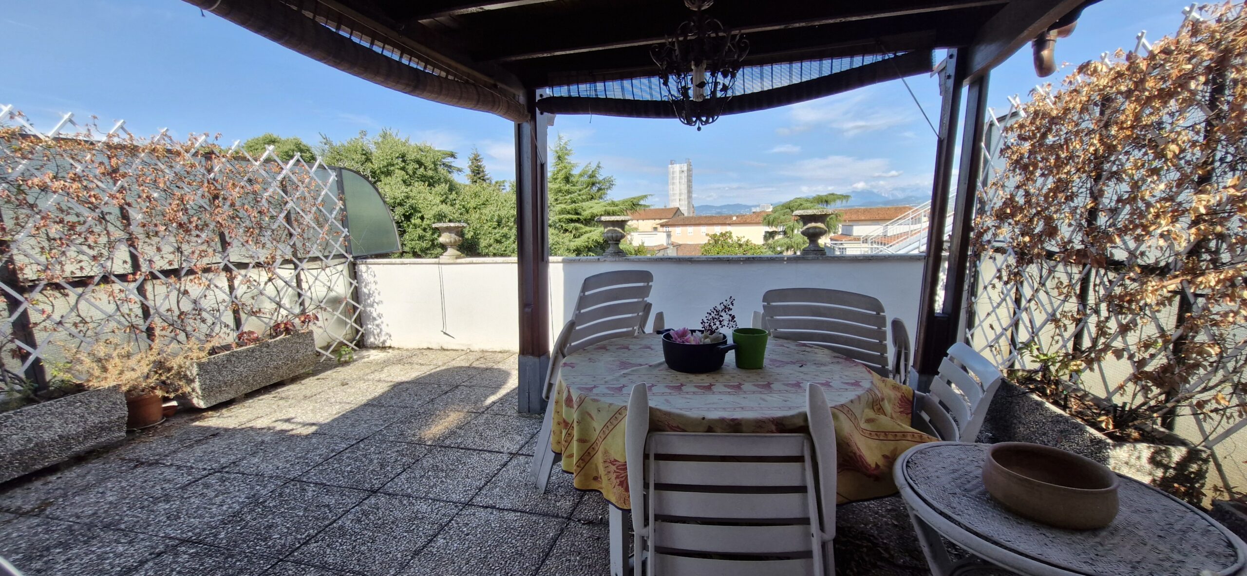 Città zona residenziale Villa Berica, in curato contesto residenziale dotato di ampio giardino comune, rara opportunità di douplex all’ultimo piano con doppio ingresso, ascensore al piano, bella zona living dotata di caminetto ed uscita sulla terrazza solarium con pompeiana , zona cucina separata, bagno ristrutturato a nuovo, ripostiglio, scala interna accede al piano inferiore dove si trovano tre ampi locali ed un secondo bagno. Riscaldamento centralizzato con contabilizzatori di calorie, impianto clima. Completa la proprietà un comodo garage ed una cantina entrambi al piano terra.